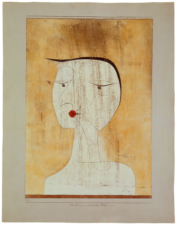 保羅·克利 《被封印的女子》1930 紙板貼紙上鋼筆與水彩,紙板下側邊上鋼筆與水彩 49 × 35 cm 國立博古睿美術館-柏林國家博物館聯盟 NG MB 140/2000 攝影:bpk圖片社/國立博古睿美術館-柏林國家博物館聯盟/延斯·齊厄