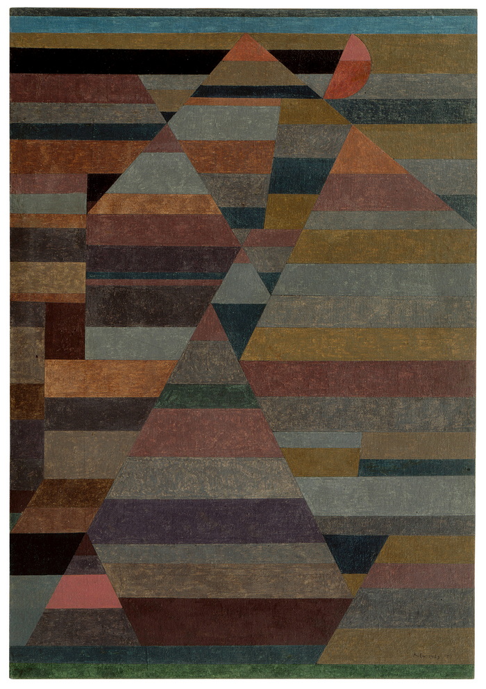 1928年的埃及之行對克利的風格可能又是一個轉變,從早期流動浪漫的線條到沉淀下由幾何方塊與色塊符號構成的宇宙萬物,視覺風格上更為拙樸、抽象,一如古埃及的壁畫。尤其是對太陽的突出描繪,占據畫面的主視覺位置。在構圖上將幾何圖塊的表現力發揮得淋漓盡致,并結合了早年對點彩技法的探索和中期對色域排列的實踐,線條也沒有被拉下,穿插其中加強了時間的動感。其于1932年創作的“Ad Parnassum”就是此集大成者。