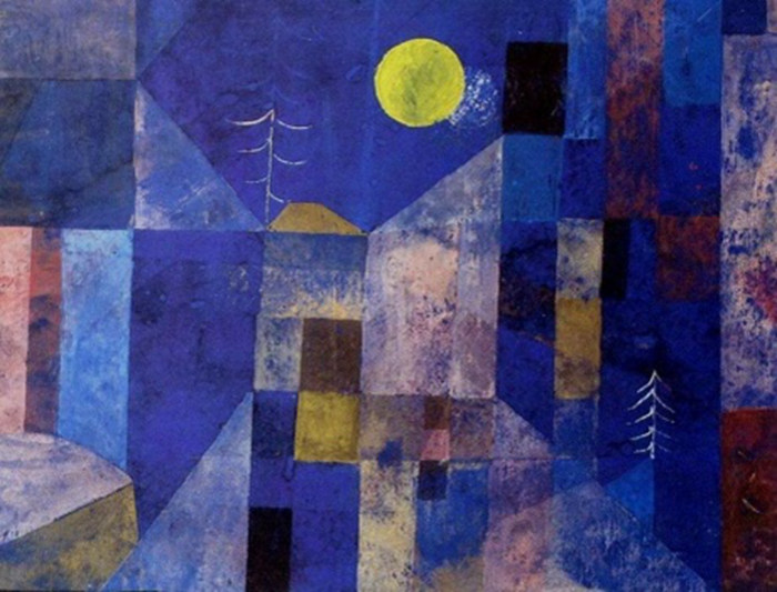 “Moonshine”(1919)一作以令人心醉的藍描繪出靜謐的夜,一輪皎月讓人感到溫暖。這幅畫創作于一戰期間,克利希冀借由藝術帶給沉重絕望之下的人們一絲希望。同樣是這輪圓月在近20年后又出現了,彼時正是藝術家人生的至暗時刻,然而他依然沒有掐滅這一絲希望之光,在1933年的“Full Moon”中,依然是這輪飽含力量的皎月,而畫面則更為“抽象”——純幾何色塊,而不再是“Moonshine”中可辨認的屋子與樹木。