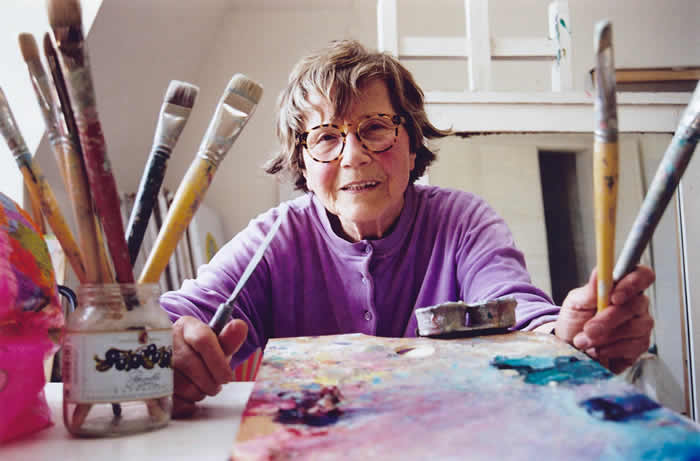 Maria Lassnig in her studio, Vienna, early 2000s