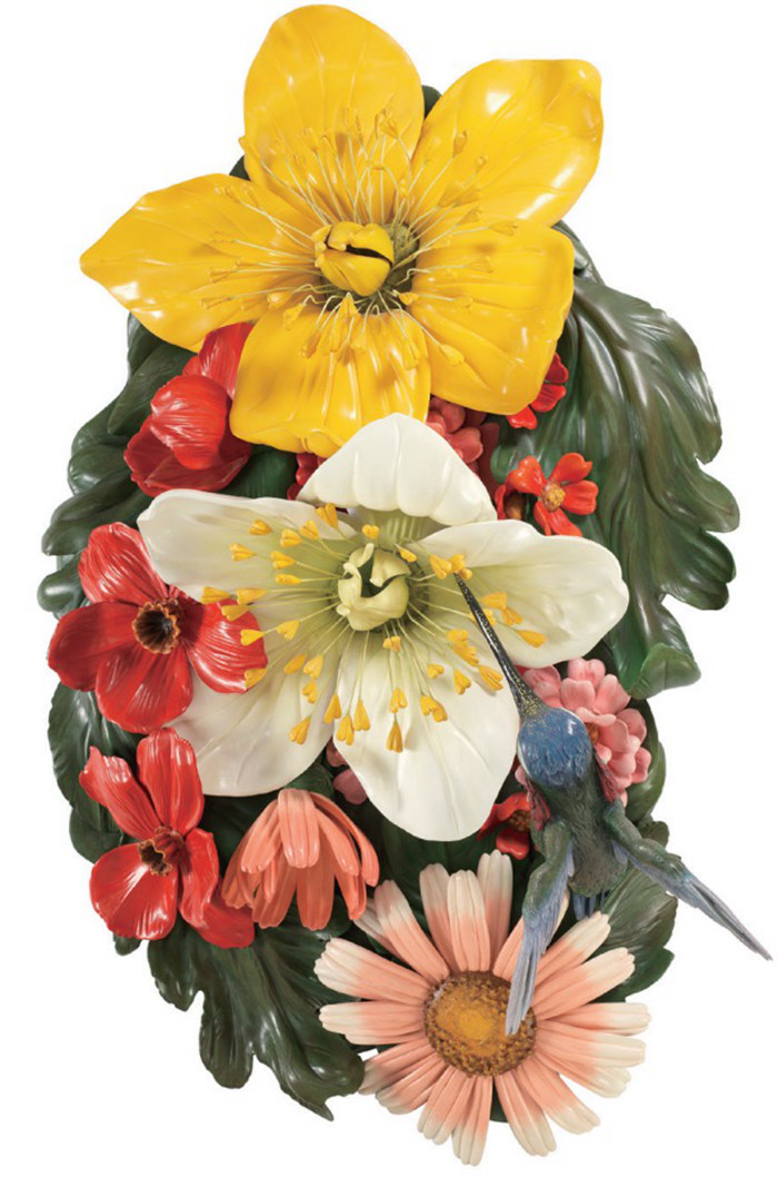 《墻面浮雕與鳥》(1991年)則出自杰夫·昆斯著名的“天堂制造”系列,花卉是杰夫·昆斯最為喜愛的主題之一,這件超真實的花朵雕塑也預示了藝術家此后直接使用活體花卉創作的《小狗》等經典作品。
