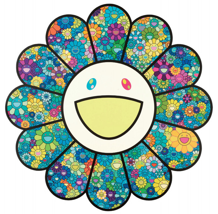 “超扁平”風格奠基人村上隆的作品極具符號感,他常將笑臉融入五彩的“太陽花”中,創造出挑戰藝術崇高感的簡單快樂的形象,此次展出的《綠意盎然的季節》就是圍繞該主題的新作。