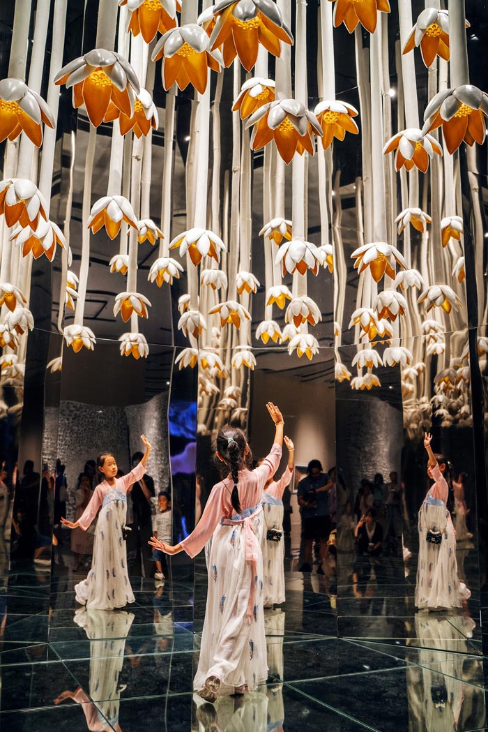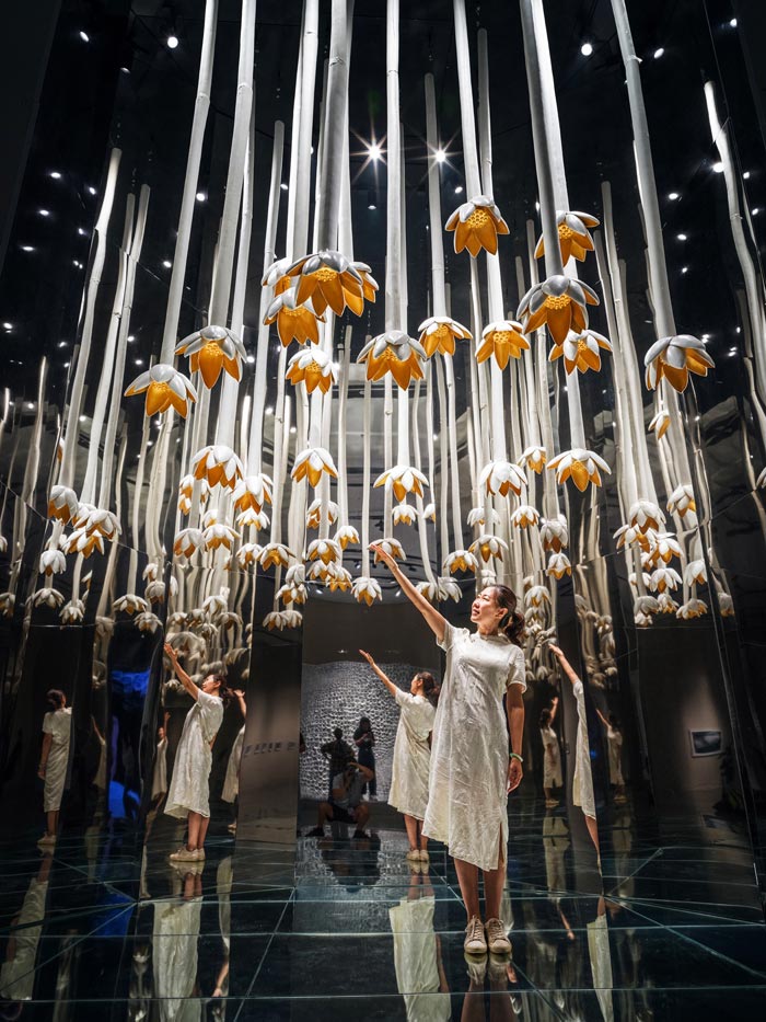 他認為,藝術家轉變為營造空間的建筑師,建造一個藝術劇場,藝術場景中作品都是當代藝術的觀念,數碼科技參與的實現方式,還有對中國傳統美學進行當代表達,觀眾在作品空間中與中國傳統文化進行情感連接,從而產生共鳴、表達、表演,繼而形成了一個動態空間的場景流,這個場景流在每時每刻的動態的變化過程中不斷進化,更多的觀眾穿著他們認為更美的服裝在作品空間中表達與拍攝,成為具有創造力的藝術場景中的藝術再生產者。