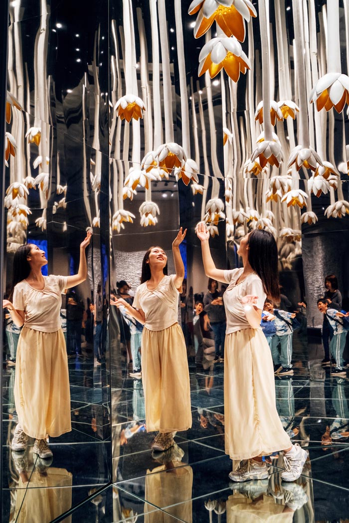 因此,在本次展覽的場景中,他借用了山水畫中留白、中國園林中的一步一景的詩意空間來表達。其中“花的精神”這組作品的每個空間中都安裝的九面立鏡和一面地面鏡,合為十面,這來自于明代宮廷畫家吳彬創作的《十面靈璧圖》,體現的是中國式的動態視角審美——自然造型的每個面都是獨特的,在動態欣賞的過程中,體驗每個面之間的變化。這樣的展覽是對中國人詩意生活的充分展現。他認為,中國式當代藝術的進步,不一定像西方藝術一樣通過對社會的反思和批判來進步,而可以是通過禮(社會秩序)與詩(自由溝通)之間的循環產生中國式的表達語境,并在這個語境涌現新知識,從而獲得進步。
