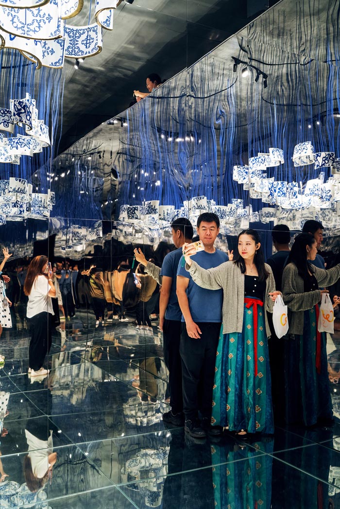 作品展出以后,在京城刮起了一陣旋風,中國工藝美術館成為了許多網紅的打卡地,每天來預約參觀的觀眾都爆滿,許多觀眾將自己拍的各種富有創造性的視頻和照片發在小紅書上,并寫下許多“美到驚艷100%”,“美炸了”等留言。原定于8月10日結束的展覽,由于觀眾打電話建議延長,所以,展覽將被延長到9月17號結束。