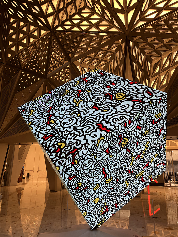涂鴉魔方——屹立在摩珀斯大堂中心的“涂鴉魔方”,是由Mr Doodle(涂鴉先生)創作的多媒體藝術裝置。其設計靈感來源于摩珀斯酒店獨特的建筑設計美學,整個裝置與無處不在的幾何結構建筑風格融為一體,其六個面都被極具呼吸感的涂鴉畫面填滿,營造出動態變幻的效果,展示了Mr Doodle(涂鴉先生)的創作才華以及對美學和創新的敏銳洞察力?!巴盔f魔方”也是藝術家向已故傳奇建筑大師扎哈?哈迪德女爵士的致敬。