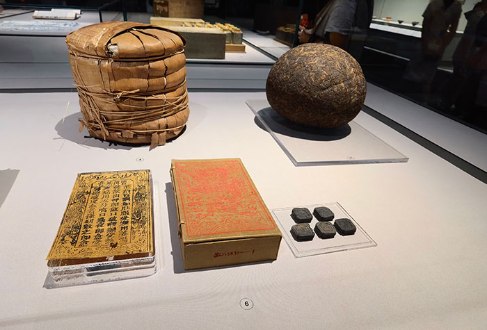 展覽以“茶出中國”、“茶道尚和”、“茶路萬里”、“茶韻綿長”四個篇章共展出展品總數達555件(組)。如此體量的展覽,作為物質實體的茶葉在展覽中所占比重雖小,卻是一個很有意思的看點,除考古出土的數千年前的茶葉遺存外,故宮博物院作為清宮舊藏的有著上百年歷史的老茶,從茶葉形制到外包裝都讓人眼前一亮,它們多為清乾隆時期各省督撫所進貢茶,為所有愛茶人和專業人士提供了一次難得的觀賞和研究契機。