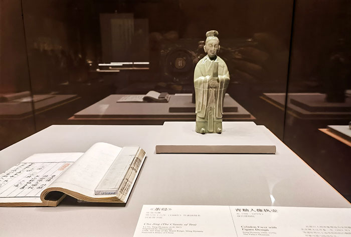 唐,陸羽撰《茶經》,明萬歷十六年竹素園刻本,國家圖書館藏(左),青釉人像執壺,宋,故宮博物院藏(右)