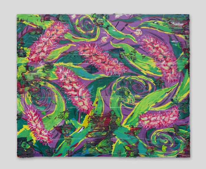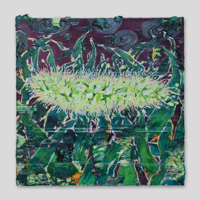 由《輪回》(2022),《夜》(2022)以及《紫色不明物體》(2022)等以植物為題材的作品代表了劉五立在2022年的工作中進入的一個新階段。這個新階段是在2021年系列的基礎上發展而來的,新階段既是對之前工作程序的跳脫,也同時是一種對之前作品的簡化與延續。具體來說,在眾多變化之中,在2021年大多數作品中出現的女性形象在2022年的系列作品中完全消失了,取而代之的是畫面中關于某一具體植物的花朵或果實的形象;以及在2021年大多數作品中出現的“繪畫性涂層”在2022年的作品中已經完全融入進了“敘事性涂層”中的具體形象之中。在《輪回》和《夜》中最先吸引觀者注意力的長條狀花朵的形象絕非寫實主義的,以及其形象的重心也并非表現細節,而這些花朵在畫面中的形象應該被描述為“表現主義的”以及“展現出旺盛生命力的”。而在《紫色不明物體》中,紫色的“茄子”部分完全從背景中的跳脫了出來,這是因為劉五立對這些“茄子”的形象采用的是粗獷的表現主義平面式的方法來構建的——我們幾乎可以把每一個“茄子”的形象理解為一個由若干條方向一致的紫色筆觸組成的色塊——在2022年的這些植物的形象中,繪畫性被置于了畫面中最主要的形象之中。