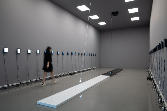 媒體藝術是運動的藝術。媒體藝術的制作、展示及傳播是不可或缺的技術過程。以錄像作品為例,它即是通過攝像機去記錄下某個行為或某種事件、發展出某段敘事,并使影像得以回放的展示機制,亦或是某種促成反饋回應的裝置。從張培力1988年的經典作品《30×30》之慎思的單一性,到陶輝《跳動的原子》以及張鼎的《高速形式#1》中精致的運動處理以及其與環境和心理之間的相互作用所見,展覽第一部分既是對“運動”作為詞意本身展開的敘述,又容納了對它的延展聯想,從而追溯駁雜紛呈的運動現象,并在運動加速的行動中,展現中國媒體藝術的多重軌跡。
