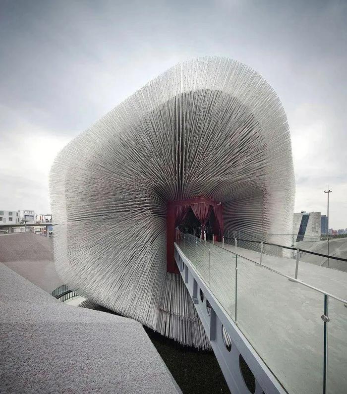 作者認為,該建筑既是國家主題展館,同時也是一件大體量的雕塑裝置。 幾千粒種子、無數根亞克力針管組成一個巨大的“種子殿堂”,遠看猶如一個毛茸茸風吹飄浮的蒲公英!而在“蒲公英”的每一根亞克力管中植入的種子,來自英國皇家植物園和中國科學院昆明植物研究所。