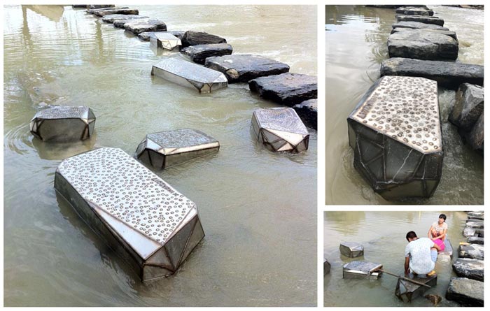 2017年,作者受邀參加在貴州隆里古鎮舉辦的“國際新媒體藝術季”駐地創作。在實地考察中了解到:隆里古鎮龍溪河碼頭河中用于過河、洗衣、渡船??康牟糠质^被洪水沖毀了,古鎮居民不能再踩著石頭過河。于是,作者用不銹鋼材料藝術化地復制河中的自然石頭,重新并且永久性安放于原來的空缺處。這組在地性較強的的不銹鋼雕塑作品,得到了策展人團隊和當地居民的積極肯定和贊賞。六年過去,當年一同參加本屆主題為“藝術、鄉村、不確定的空間”藝術季的中外藝術家的作品,如今有許多已經不見蹤影或者頹朽,而這一組被命名為《踩著石頭過河》的藝術“石頭”,卻讓古鎮的居民們越踩(過河)越新,越用(洗衣)越新鮮光亮!