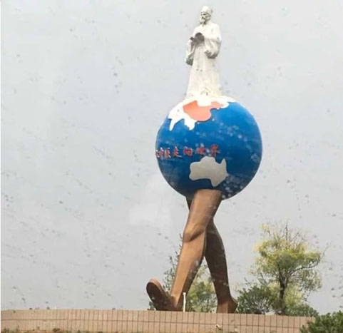 其二,公共藝術的“在地性”還有另外一種情況,即過度、機械、盲目、偏頗,甚至極端的強調在地性和地方特色,或者不切實際的要求具有世界性全球性,亦或是作者囫圇吞棗、創作不到位,也容易導致公共藝術品出現膚淺、庸俗、奇葩甚至嚇人的雕塑或者公共建筑。如上圖“中醫走向世界”以及近年一些機構、媒體相繼評選出來的丑陋、庸俗建筑和雕塑等。