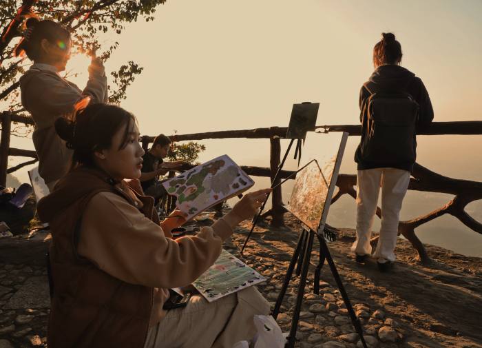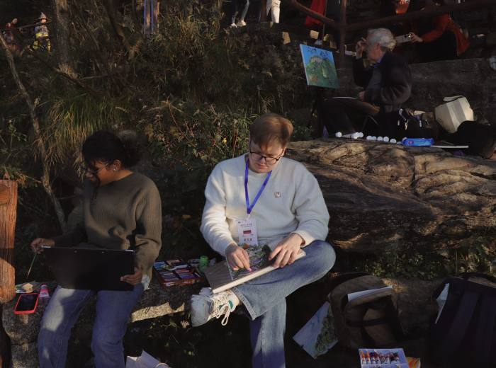 啟動儀式結束后,中外藝術家們登上廬山,前往仙人洞、錦繡谷參觀寫生。仙人洞是廬山最具代表性的景觀之一,深受游人喜愛。錦繡谷中斷崖、怪石、峭壁、險峰匯集,一路景色如錦繡畫卷。藝術家們初識廬山,被廬山秀美的風景所感動,用精彩的藝術作品品味著自然與心靈之間的對話。