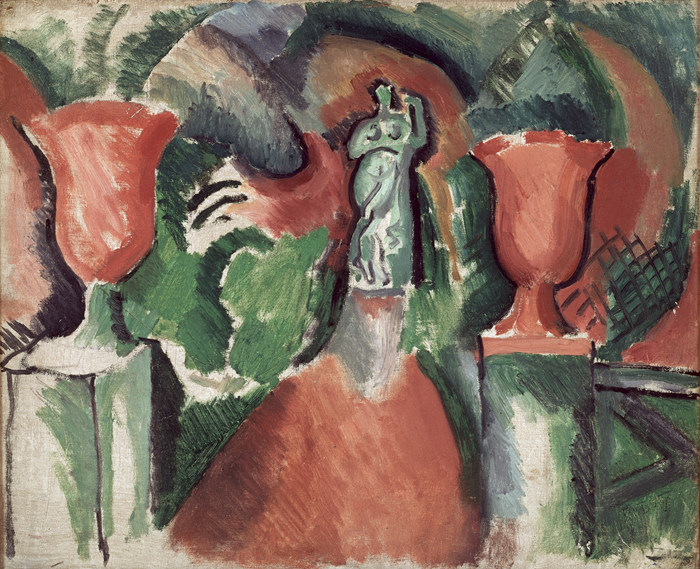 《兩個紅色花瓶和雕像》,約1908年,布面油畫,37.5 × 45 厘米 ? Adagp, Paris
