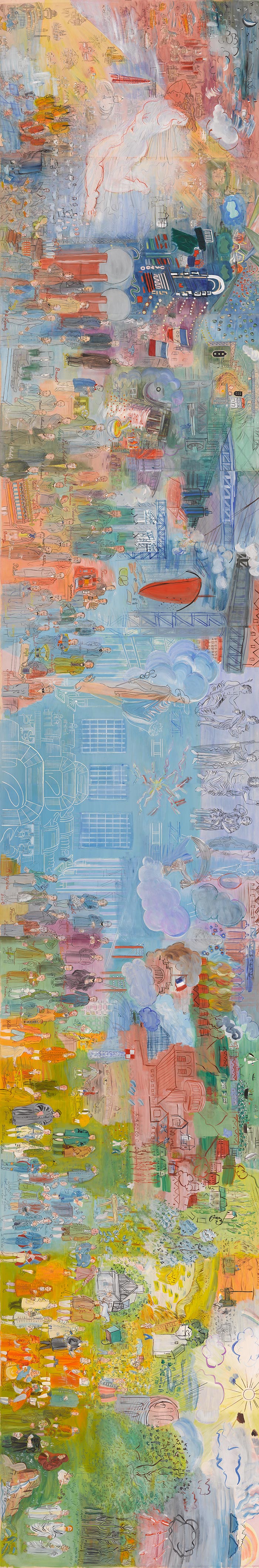 《電氣精靈》通過神話與寓言故事的交融,描摹了從古至今的亞里士多德、阿基米德、達·芬奇、伽利略、牛頓、愛迪生、居里夫人等在內的111位哲學家、科學家和思想家的肖像,不僅展現了電力對人類生活的巨大改變,也同時歌頌了人類自古以來在物理學尤其是電學方面的成就。杜菲為還原當時的巨型壁畫,于晚年通過版畫的形式再繪《電氣精靈》,得以與當下的觀眾分享當時的杰作。
