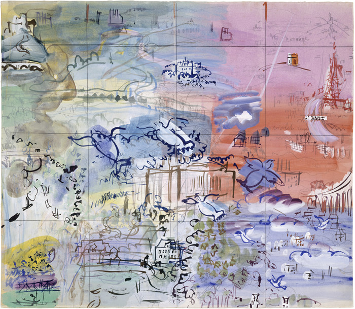 杜菲在整個藝術生涯中不斷展現出驚人的適應能力,并以令人欽佩的靈巧手法掌握各種介質。他不僅在架上繪畫領域取得了成功,也參與了許多大規模的公共藝術委托項目,更作為一位高產的裝飾藝術家,表現出了非凡的天賦。自藝術生涯伊始,杜菲就對裝飾藝術的全部領域有所涉獵。他創作過大受歡迎的時裝設計和織物設計,成為上世紀20年代時尚界大革新的重要一員,從掛毯制作、陶瓷藝術,到戲劇裝飾設計、書籍插畫,杜菲在這些領域做出頻繁而深刻的貢獻,這在其同時代藝術家中是絕無僅有的。在實用藝術領域不尋常的活躍也對杜菲繪畫實踐的發展產生了影響。