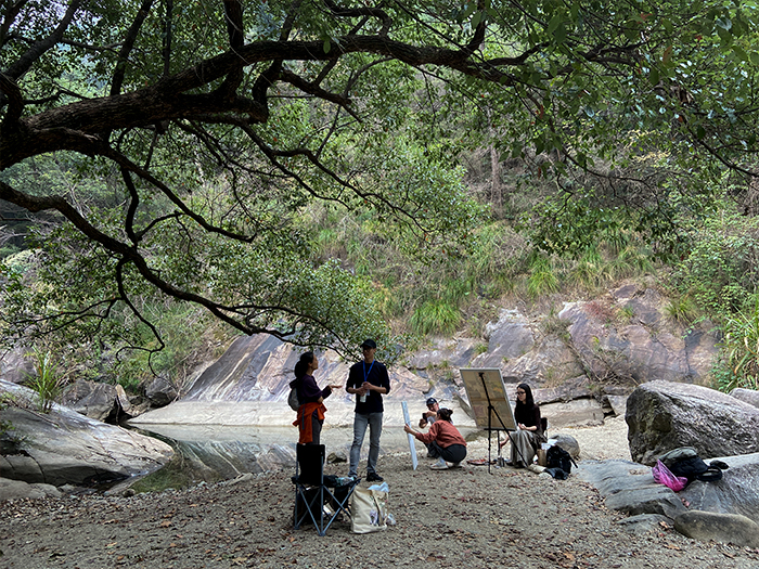 藝術家參觀寫生的廬山植物園,是中國近代植物學家胡先骕、秦仁昌和陳封懷三位先生于1934年親手創辦,是我國第一座亞熱帶山地植物園,目前已匯集國內外植物3400多種。植物園環境優雅,高大挺拔的杉樹枝繁葉茂,樹葉在清透的陽光下閃爍著光斑,林間點綴著輕柔的灌叢和草地,走在林間,泥土和青草的氣息撲面而至。在這樣的宜人的自然環境中,藝術家感覺身心愉悅。