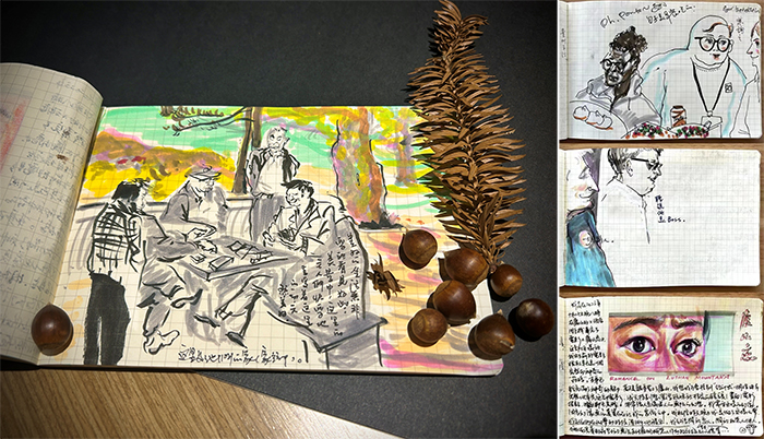 來自中國澳門的藝術家孟舒是一位玻璃藝術家,她的創作方式是把每一天的點滴見聞和感受記錄在筆記本中,并以速寫的方式描繪了很多藝術家聚會場景和特寫鏡頭,成為本次“畫廬山 看中國”活動的一本視覺日志。