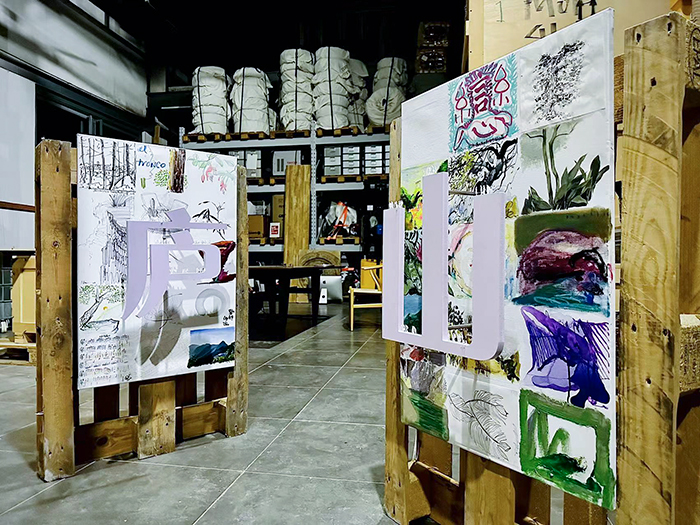 德國藝術家江霓渙自述德國的自然環境中人是很少的,他習慣了獨自面對自然,但他在廬山看到有很多人,尤其在山上還有如此多的房子,感覺很不可思議。他用了一組紙鋪在地上,他用單純的紫色在紙面上描繪了抽象的物象來表達對廬山的感受。