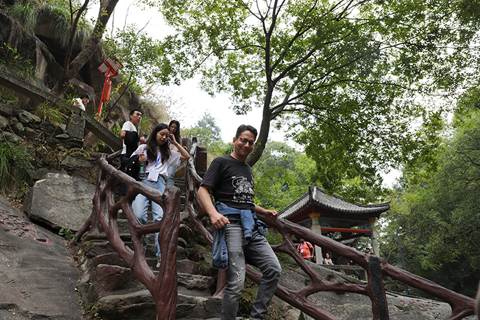 伊瑞是一位非常有個性的捷克藝術家,他的一身牛仔裝飾在景區非常引人著名,被成為“水墨牛仔”,他對于中國文化有很深的理解,在很多中國游客都忌憚攀爬的秀峰景區,他不顧辛苦,飛快地攀爬到瀑布最近的九天池,在地上他鋪開兩米多寬的畫氈,在宣紙上面對飛瀑和巨崖以水墨的方式創作。