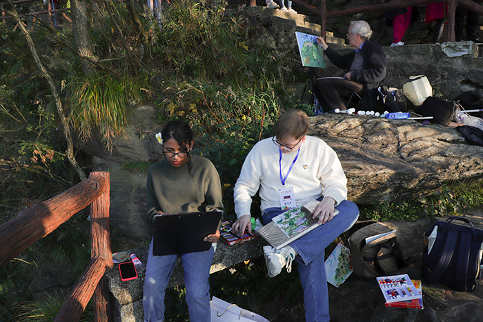 在“畫廬山 看中國”五天的行程和三天的采風中,36位中外藝術家共同旅行、生活、創作和交流,拉近了這些來自六大洲、不同地域和不同文化背景的藝術家的心靈距離,大家很快就變得熟悉起來。創作間隙時,他們交流著對藝術創作的經驗和感受;在旅途和休憩時,大家也彼此分享著對廬山美景、古建、美食和各國文化的感受。