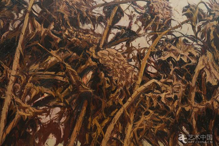 許江筆下的葵總是成片出現。即使是獨立的葵頭,也多以成組的形式展出。群葵簇擁,聚成排山倒海的氣勢。
