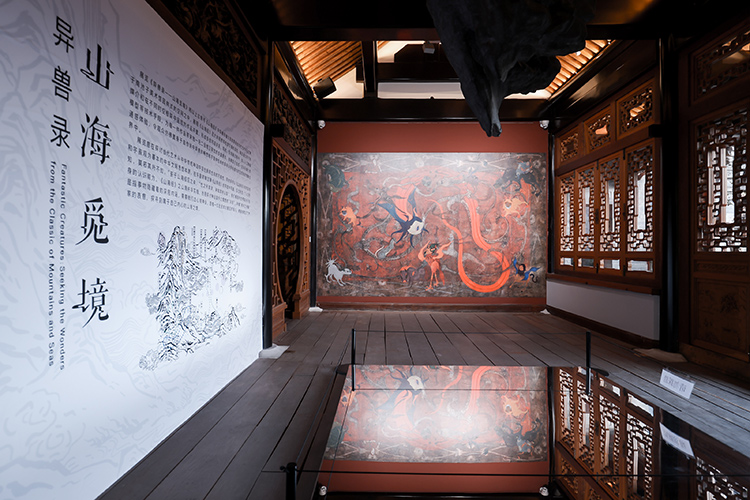 似乎每個中國人都知道《山海經》,但如果再深深的問下去,《山海經》到底是什么?它寫過什么?畫過什么?它想告訴我們什么?現代人能從中汲取什么?本次重磅展陳中,那些放在架上,嵌入墻里,貼在樹邊,映在水中的件件精品,也許是我們對當下社會的共同思考和回應,是對上古人類在大自然面前,一次次悲欣交集的內心重溫。傳統文化的回歸中,那條我們很久沒有走過的路,將我們帶去一個美好的方向。
