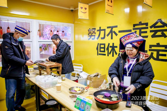 城隍驢肉火燒散發出大蔥與鮮肉的濃郁香氣;一顆顆圓滾滾的青島糖球吸引了兒童駐足;現場熬煮的大鍋綏德羊肉湯熱氣騰騰,驅趕了寒意;天等壯族五彩糍粑用天然植物染料將潔白無暇的清香糯米染成彩色,帶來獨特的嗅覺、視覺和味覺體驗。成都糖畫代傳承人謝豐坤以銅勺為筆,以糖液作畫,運腕走勺之間,一幅幅金黃色的糖畫完成,龍、雞、蝴蝶等各種動物形象栩栩如生?,F場還有吳堡手工掛面、周村燒餅、桂林米粉、德州扒雞、雨羊包、錢袋羊肚等各地非遺美食,滿足人們味蕾。