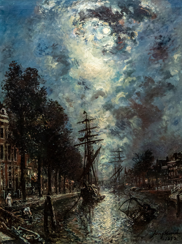 展覽現場的這幅《鹿特丹運河》很“印象派”,被巴黎沙龍拒絕也不算奇怪。1874年,第一次印象派展覽邀請戎金攜此作參展,戎金拒絕了——這有點奇怪,但放在戎金身上,似乎又不太奇怪了。