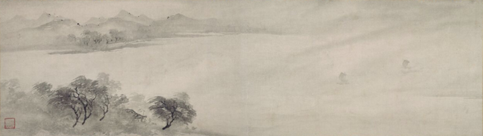 現存日本的《瀟湘八景圖》描繪了洞庭湖及其周邊地區的八種風景,《煙寺晚鐘圖》《漁村夕照圖》《遠浦歸帆圖》《平沙落雁圖》為僅存的四幅真跡。畫面空靈清寂、疏闊淡遠?!稙t湘八景圖》歷來是中國畫家熱衷的題材,其他畫家多對景物做細致刻畫,而牧溪的作品幾乎沒有一點著力刻畫的地方,樹林、居舍、遠帆、孤船、大雁如殘影疏痕地隱沒在湖光霧靄中,相比莫奈和透納逸筆草草的外光寫生作品更接近于虛無。這也難怪元代《畫繼補遺》評價牧溪的畫為“為僧房助清幽耳”。