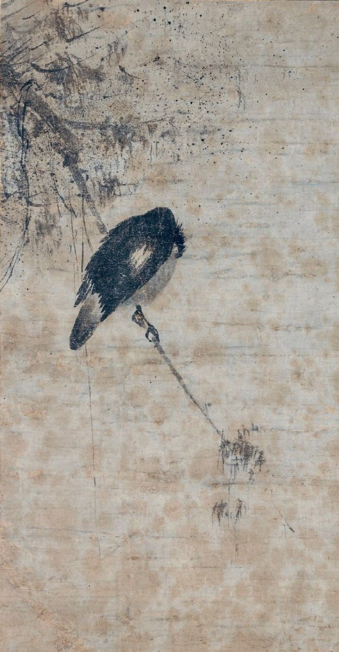 當時文人水墨畫剛剛興起,起源于北宋兼工帶寫的一派,如蘇軾、趙佶的畫竹,只用濃淡墨一筆畫成,不用勾勒,牧溪可能受這種畫法影響,創造性將水墨技巧施用于鳥獸人物畫中,這也為后世水墨寫意花鳥開創了先河。但牧溪的技法不局限于此,牧溪嘗嘗創造性地使用一些奇特的取勢、構圖和筆法,構圖上也不局限于南宋流行的邊角構圖,他的構圖居無定法,完全隨物象和心性流轉,筆法也無定法,有的符合書法用筆,有的又像西方表現主義的涂抹、點撒或水墨的隨意暈染。實際上,牧溪作為出家人自然是不會遵循常規畫法的局限,他的畫既不雅也不工,而是在天地靜謐中不經意間展示出自然造物的盎然生趣。