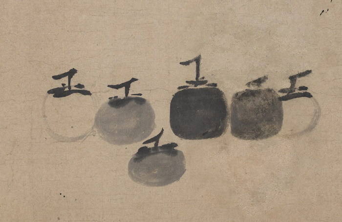 從禪畫的特點來說,一般禪僧作畫并非像文人畫那樣抒情寫意,更有通過繪畫來參悟佛理之用。佛教有“實相無相”的世界觀,通俗地理解就是佛教認為物質實體是可見可觸的存在,具有相對的穩定性,但并非一成不變,一切法幻而不真——人不必過于執著于世界的表象?!读翀D》中的實體均為柿子,由實而虛也可理解為柿子隨時間的流逝逐步脫離于實體外形而接近“空相”。