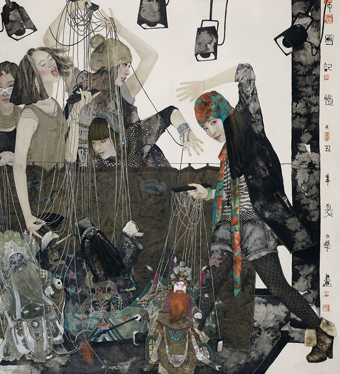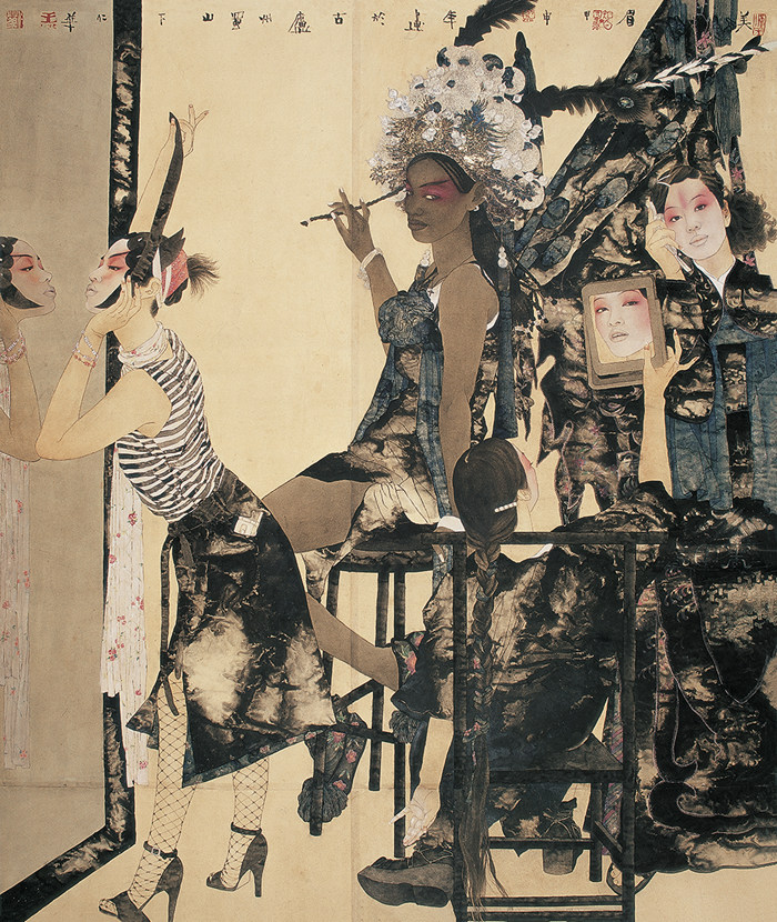 王仁華:我喜歡畫精神,我在畫的時候,能把那種讓我激動的東西收拾出來。我喜歡很調皮的這種樣子,比如這張《似水似風似云》,底下的腳我會把它翻過來,因為我體驗過這種狀態。但是我也特別注意中國文化元素的表達,像“提線木偶”等。在《美眉》這張畫里有一個黑人,我讓她戴一個鳳冠。這是我1997年在央美進修的時候,我們在中國京劇團旁的一個地方,那天我們下課了去吃飯,有一個黑人女孩抱著一個鳳冠,估計是來學戲的,正在往樓上面跑。我一看,好美!能畫一張畫,后來我就把它畫在參加第十屆全國美展作品的中間了。
