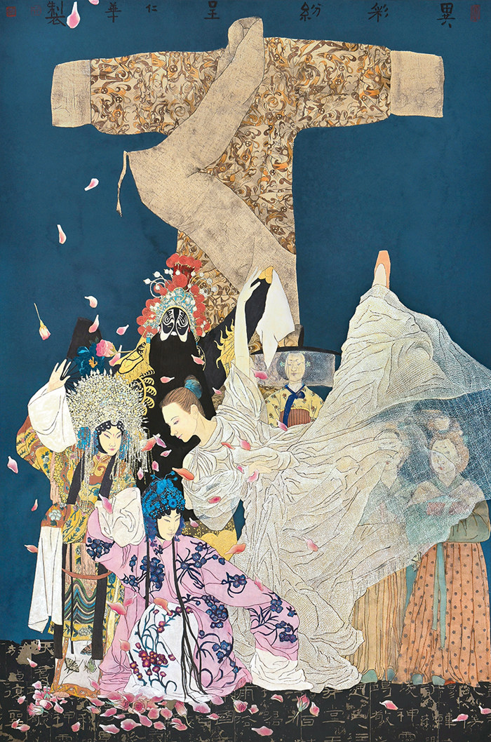 2019年第八屆北京國際雙年展邀請我參加,那一屆主題是“多彩世界與共同命運”,我希望展示世界文化的友好交流和融洽互鑒。我就想到了芭蕾舞,因為它是發源于俄羅斯的,也在西方也特別的流行,同時我們中國也有自己的芭蕾舞,這就是一種交流互鑒。然后我把漢袍一下展現出來,橫亙在畫面的正上方,底下就是西方的芭蕾和中國各種戲曲形式。我從骨子里,還是希望通過國際舞臺弘揚中國文化。