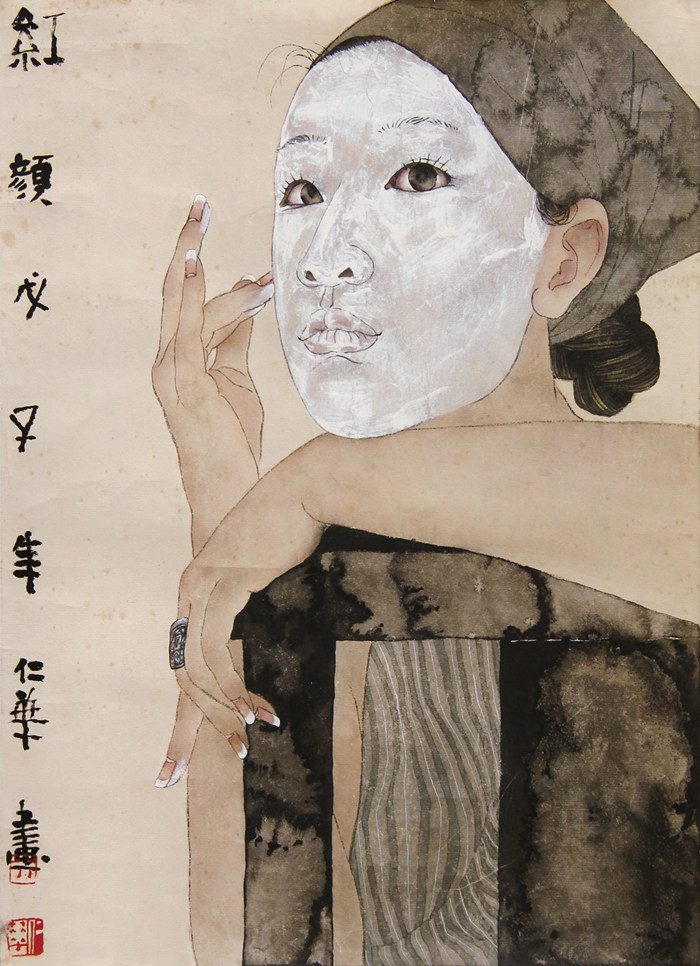 “水、風、云”雖是輕柔的,但其內在力量不容忽視,往往細微的事物隱匿著大境界。畫中時尚女子托腮凝視,一抹純白粉飾的臉上寫滿各種角色的人生,冷艷的眼神里充滿復雜的情緒,那是輕蔑,是冷漠,是眾人皆醉我獨醒的“愚鈍”。女子赤裸的雙腳是擺脫束縛向自由宣告,一只紅色老木桌收藏了多少古老的傳說?;蛟S,戴白色面具的女子,是無數女子的縮影,是女性時代的覺醒,是對真相的質疑、人性的拷問。