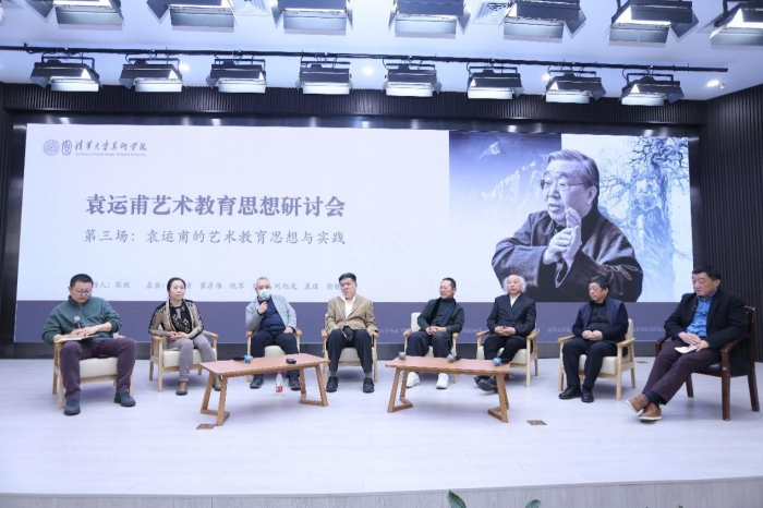 斯坦福大學終身教授、旅美藝術家謝曉澤,清華大學美術學院繪畫系教授姜祖青、崔彥偉,藝術家倪軍,中央美術學院教授劉斌,北京電影學院教授劉旭光,袁運甫先生的同事宿利群,袁運甫先生家屬、清華大學美術學院教授袁佐依次作主題發言。謝曉澤通過視頻回顧了袁運甫先生的跨學科藝術貢獻和自己跟隨袁先生學習的受益。姜祖青談及袁運甫先生開放包容的教學和前瞻性、系統性、可實施性的藝術理念和教學實踐。崔彥偉講述了中央工藝美術學院(今清華大學美術學院)的工作室教學與袁運甫先生的多元藝術實踐,探討如何在現在的藝術教學中發揚和繼承袁運甫先生的藝術主張。倪軍從袁運甫先生藝術教育思想的國際視野角度,強調其留下的藝術精神財富對于當今的藝術教育有著重要的啟示。劉斌從造型專業的角度,闡述了袁運甫先生對學生的信任與幫助,以及對學生潛能的發掘與培養。劉旭光分享了袁運甫先生關于“文質”概念的探討,以及對當代藝術創作從內容到形式的思考。宿利群講述了四則袁運甫先生的故事,生動闡釋了袁運甫先生能人善用,惜才愛才的溫暖形象。袁佐回憶了袁運甫先生對全校師生作學術報告的講話內容,談及他對藝術教育與社會美育的美好愿景。