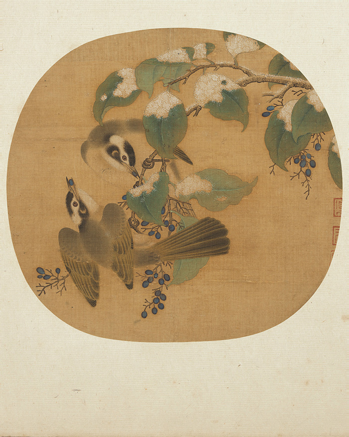 《雪景寒禽圖》由南宋畫家王定國所繪,圖繪一枝綠葉紫果樹杈,果實繁茂,一對山雀雙腳抓枝,一只作啄食狀,另一只山雀背向側首吊掛于梢尖上。枝干和葉子上覆蓋積雪,雙雀在此覓食顯得生動活潑。