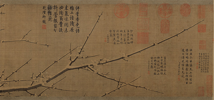 這幅《雪中梅竹圖》,層層積雪覆蓋在梅枝與修竹上,一簇簇梅花綻放點綴枝頭,挺立的修竹與梅枝交叉錯落,原本的紅梅和綠竹皆以水墨所繪,筆法清逸瀟灑,意境清幽朦朧,充滿詩情畫意。此畫前有乾隆題詩引首,后有宋揚無咎行書《柳梢青》十闕,元吳瓘《梅枝圖》及吳鎮(號梅花道人)《梅竹圖》。其作者徐禹功畫史無傳,善畫水墨梅竹,師從楊無咎。