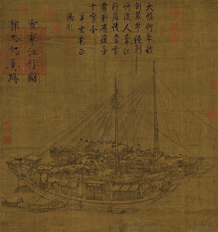 《雪霽江行圖》描繪雪霽后,兩艘載滿貨物的船只在江邊前行。長于界畫的作者郭忠恕以墨線描繪船只,同時精細呈現出船夫們忙碌勞作的多樣情態,有人躬身縮頸搬運貨物,有人奮力撐篙,有人正在掌舵。不管是船只的結構、船上的物件還是人物活動,都描寫得詳盡而嚴謹,情節生動具體,富有生活氣息。由于是冬季,船艙頂上還覆蓋著皚皚的白雪,天空與水面以淡墨描繪,表現出了氣候的寒冷與陰霾。