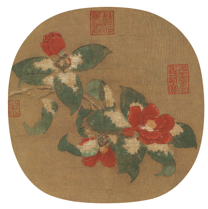 林椿任職于南宋畫院,是有名的花鳥畫家,師承趙昌,他善用精妙的色彩變化,再現自然生命。本幅《山茶霽雪圖頁》畫三朵山茶花在冬雪中盛放,一仰一俯一含苞,艷麗的紅色與葉子的翠綠,襯得瑞雪潔白脫俗,形似與詩意皆備。在白雪紛飛的環境中,一抹艷紅綻放在沉寂大地上,姿態堅強動人,是風骨的象征,展現無盡生意,暖人心房。這幅畫細節具體,顯然是畫家細心觀察對自然物象寫生之后的創造。