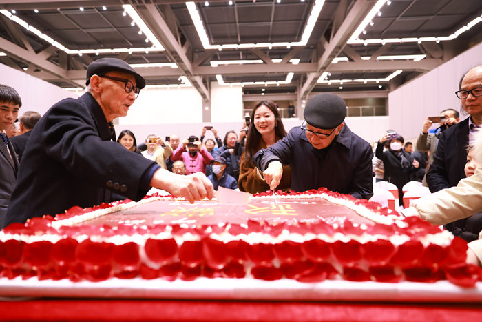 致辭過后,在場觀眾熱烈鼓掌,向經歷了九秩人生的靳尚誼和邵大箴先生表示敬意并獻上蛋糕,開幕式在一片喜慶祥和的氣氛中結束。