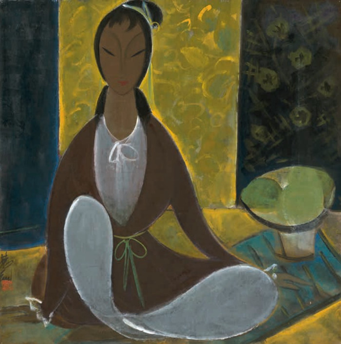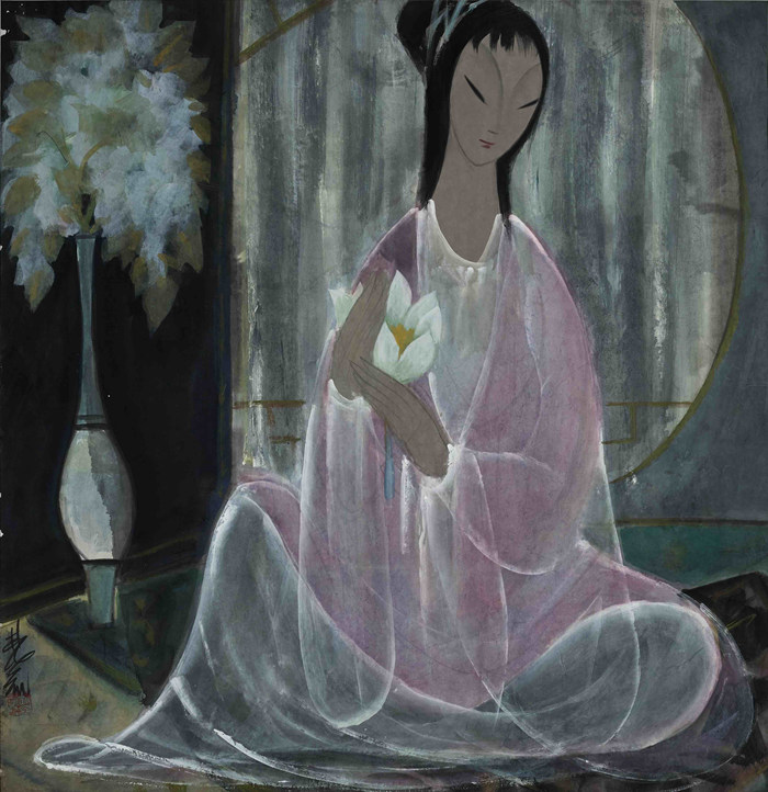 譬如此次展出的其代表性的仕女畫——包括最受人喜愛的《捧白蓮的女子》《青桃盤仕女》等,畫中時常出現馬蒂斯式背景、莫迪里阿尼式儀態,以及源于西方現代藝術表現觀念的高度簡化凝練的圖式,但同時畫中女子又充滿含蓄清雅的中國古典韻味,甚至含有來自唐宋瓷器、敦煌壁畫的靈感。