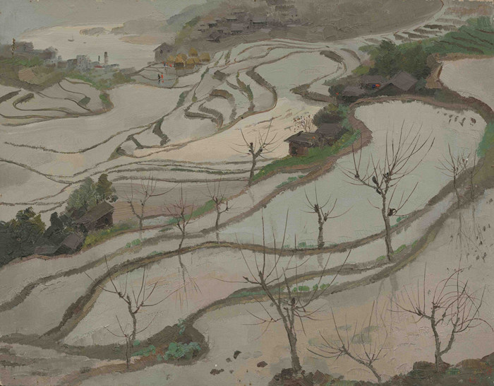 水田(一),吳冠中,木板油畫,1973年,47cm×60cm