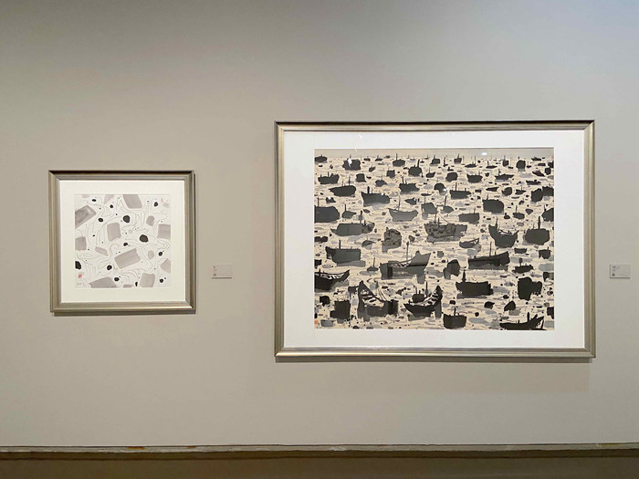 展覽右側展廳呈現了吳冠中藝術生涯的脈絡。出生于1919年,吳冠中在1936-1950年間于杭州國立藝專學習并赴法留學?;貒?,他起初探索油畫民族化(1951-1974),及至1975 -1999年進入油畫民族化、國畫現代化并進的成熟期。生命的最后十年(2000-2010),吳冠中的藝術創作進入更為自由的境界,無問東西古今、抽象具象或油畫水墨之差異,一切創作手段都讓位于情感的自由抒發。
