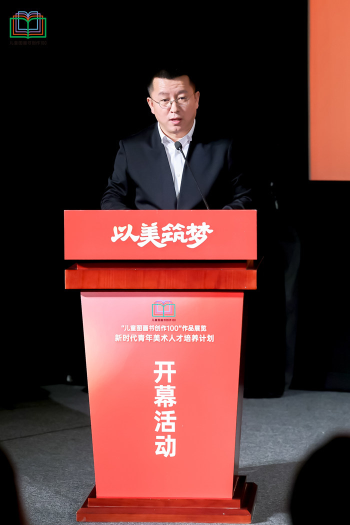 中國美術家協會分黨組書記、駐會副主席、秘書長馬鋒輝在開幕式致辭中指出,“兒童圖畫書創作100項目”是美術界學習貫徹習近平文化思想特別是貫徹落實習近平總書記關于美育工作重要指示精神的具體舉措。習近平總書記在給中央美術學院8位老教授的回信中指出,做好美育工作,要堅持立德樹人,扎根時代生活,遵循美育特點,弘揚中華美育精神,讓祖國下一代身心都健康成長。近年來,中國美協進行廣泛調研、精心謀劃,決定啟動新時代青年美術人才培養計劃,先期實施的“兒童圖畫書創作100”項目,就是要培養一批青年兒童圖畫書作者,提升原創中國兒童圖畫書的創作水平與出版質量。我們衷心希望通過這次展覽,能激勵更多青年美術家參與、從事原創兒童圖畫書創作中去,通過美的傳播,啟發少年兒童感知中國文化,增強愛國情感,培育社會主義核心價值觀,讓他們在昂揚向上、樂觀健康的審美世界中健康成長。同時,他認為此次展覽的舉辦、圖畫書作品的結集出版以及后續藝術衍生品研發等一系列活動,將會對提升原創中國兒童圖畫書的影響力和覆蓋面產生積極的作用。這不僅有助于提高我國兒童圖畫書的知名度和市場份額,還能為相關產業鏈帶來新的發展機遇,推動文化產業的繁榮。他表示中國美協也將以此項目為抓手,形成長效扶持、培養和激勵機制。持續推進優秀原創兒童圖畫書的創作,力爭推出更多具有中國特色、中國風格、中國氣派的兒童讀物,為扎實推進文化強國和中華民族現代文明建設作出新的貢獻。