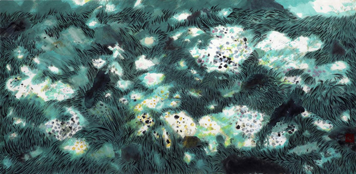 我覺得莊子“庖丁解?!钡墓适轮v得很清楚了,開始看見是全牛,最后腦子里眼睛里沒有牛了,全是空隙了,我們現在就是要通過我們看到的物的實體進入那個空,唯進入那個空里去,才能自由??帐窃谶\動的,作畫就像舞蹈一樣,講節奏和韻律。身心的節奏和韻律,你感覺對了舒服了,這個畫才對了。你要是感覺自己身心不舒服,作畫的時候緊張,別別扭扭的,那肯定畫不好。畫家是用自己的身體這么一個最敏感的儀器和天地相連的,和自然萬物貫通的,從中去成就藝術。為什么機器藝術不能代替人的藝術呢?第一就是人的情感,第二就是人這個機體敏感,他是在沒有預設的情況下,能夠感覺到很多。這種生成,靠一種直覺,這個直覺有心覺有氣覺,特別是氣感,能夠感受周圍的一切,是機器代替不了的。機器沒有氣感,機器都是指令,邏輯、知識輸進去,按程序走的。繪畫不能按程序走,它沒有程序,必須要放掉,甚至放空一切,腦子都是空的,這個時候腦子里的知識、邏輯全都消除得一無所有。只有身體里的直覺和氣覺,身體的感應、手感的節奏,都渾然一體,和你的想象都合一了,這個時候的繪畫過程出現一種忘我的狀態,就像我做畫時,周圍一切聽不見也看不見。無我,在中國畫中特別重要。我們需要一段時間去體驗,我也在不斷地體驗,不斷地追問,然后才能慢慢進入這個狀態。但也不是說我現在就修煉好了,我還在路上,還差得很遠。藝術無止境,最后永遠是未知。