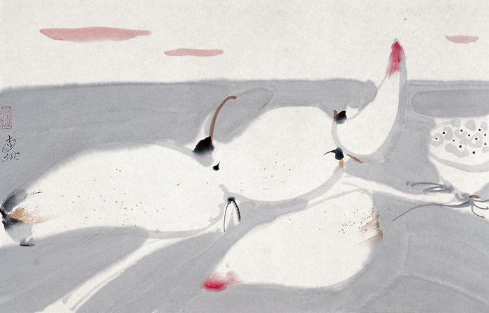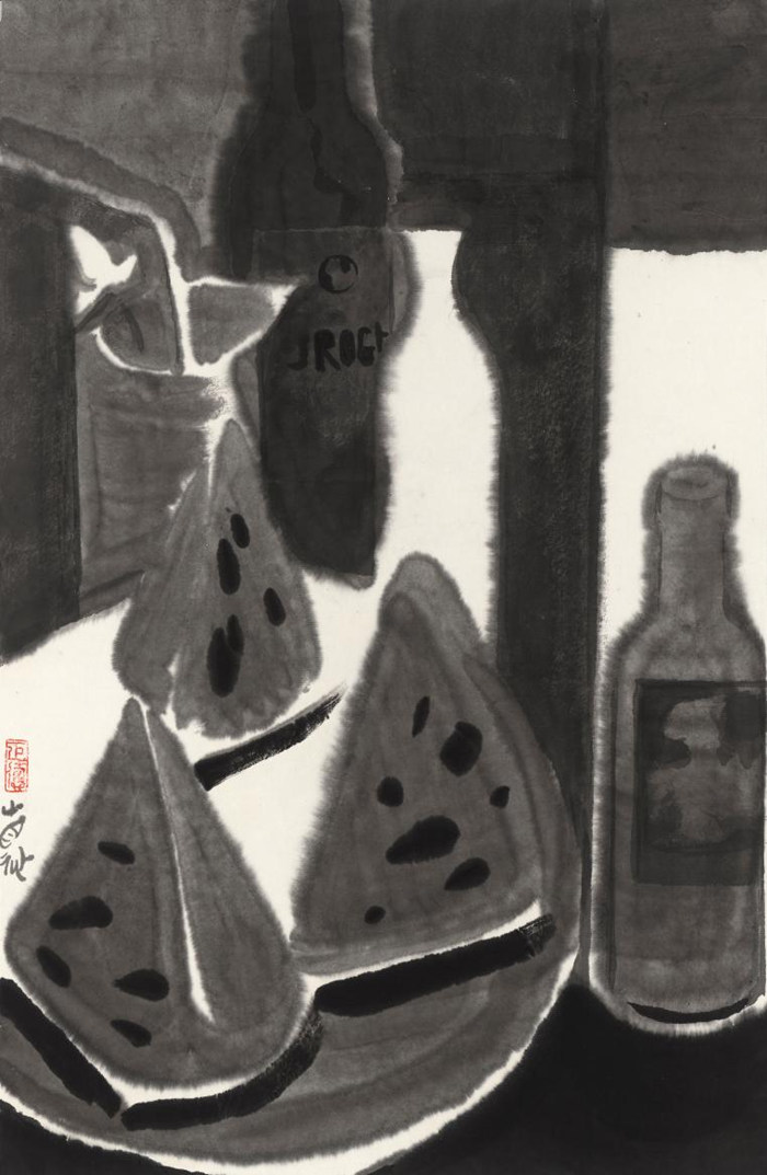 第二個,當我們講到構圖和章法和圖式的時候,特別講到構圖的時候,我們在現代語境里面,對畫面的經營也好、對畫面的把握,是有它的本體規律的,特別從水墨畫,意象性造型的畫面,劉先生的畫中,對形的把握,特別是形的構成性的把握上是有大的一種經營意識跟結構意識,這種意識使得他的作品既有筆筆相生的作家的近似于印象派面對外觀的速度感的東西,即興性的那種東西,同時又有非常感性的東西在背后,這是劉先生在我看來也是老工藝美院傳統之中,原來以圖案、圖式、裝飾為生發點影響到中國繪畫對20世紀產生巨大影響的這么一支風格里面最重要的一個貢獻。