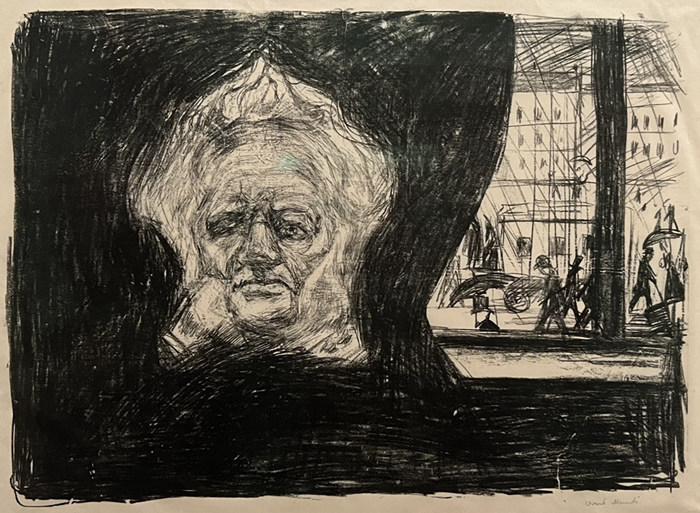 《易卜生在格蘭咖啡館》,蒙克,石版畫,1902,柏林國家博物館之版畫素描博物館藏品