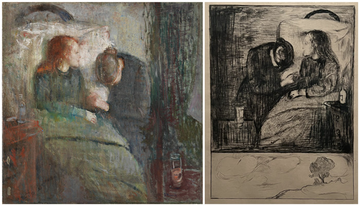 《病中的女孩》,蒙克,左圖*:油畫,1885/1886,奧斯陸國立美術博物館藏品;右圖:干刻技法蝕刻版畫(drypoint),1894,柏林國家博物館之版畫素描博物館藏品